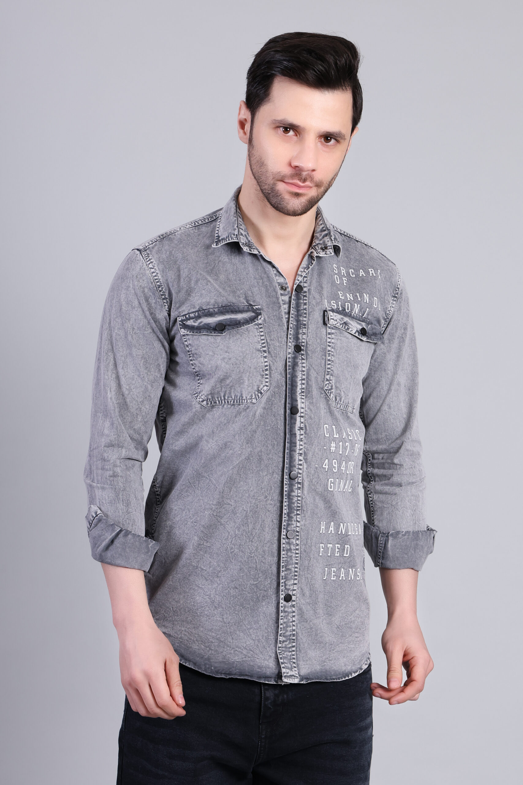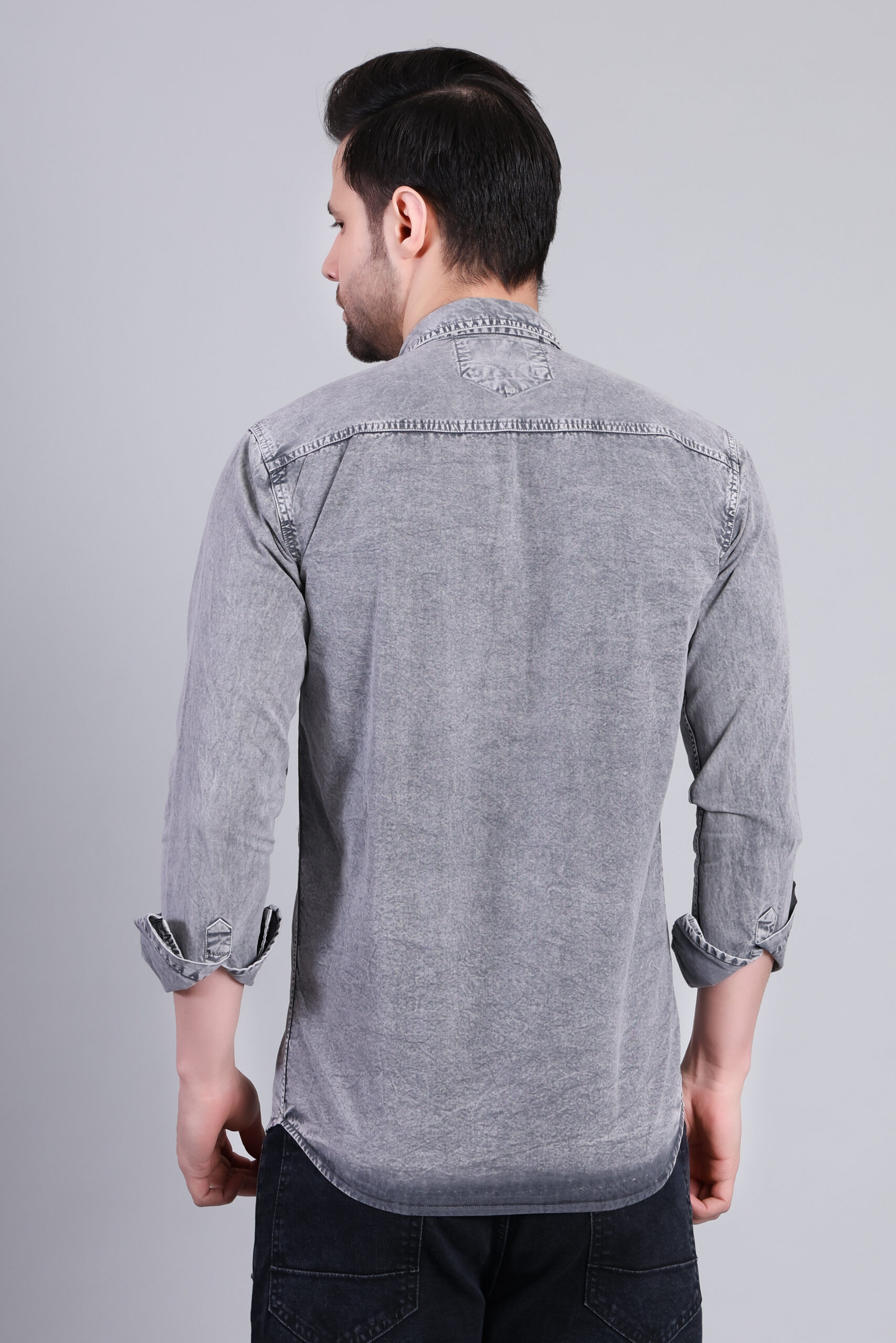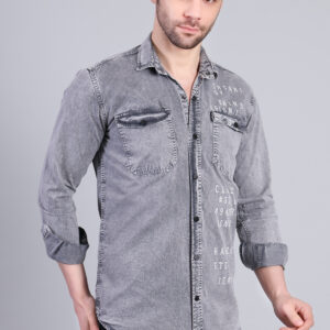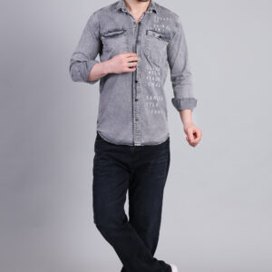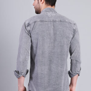 A modern grey washed denim shirt designed with a rugged yet refined finish. Featuring a sharp silhouette and soft-touch fabric, this shirt delivers effortless style and all-day comfort—ideal for casual outings and urban wear.